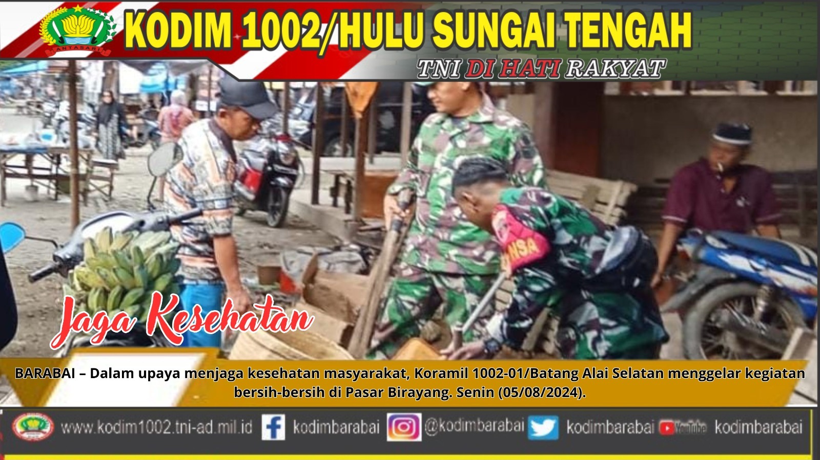 BARABAI – Dalam upaya menjaga kesehatan masyarakat, Koramil 1002-01/Batang Alai Selatan menggelar kegiatan bersih-bersih di Pasar Birayang. Senin (05/08/2024).