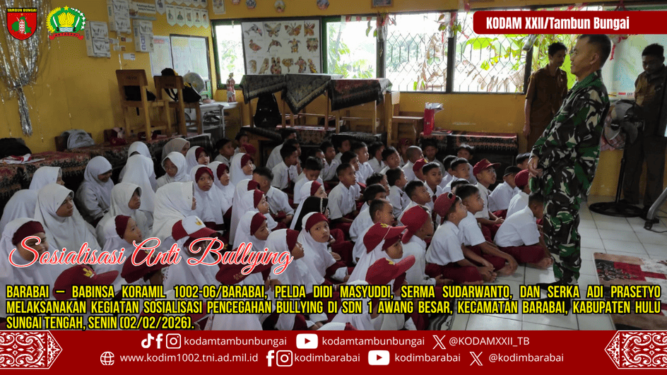 BARABAI – Babinsa Koramil 1002-06/Barabai, Pelda Didi Masyuddi, Serma Sudarwanto, dan Serka Adi Prasetyo melaksanakan kegiatan sosialisasi pencegahan bullying di SDN 1 Awang Besar, Kecamatan Barabai, Kabupaten Hulu Sungai Tengah, Senin (02/02/2026).