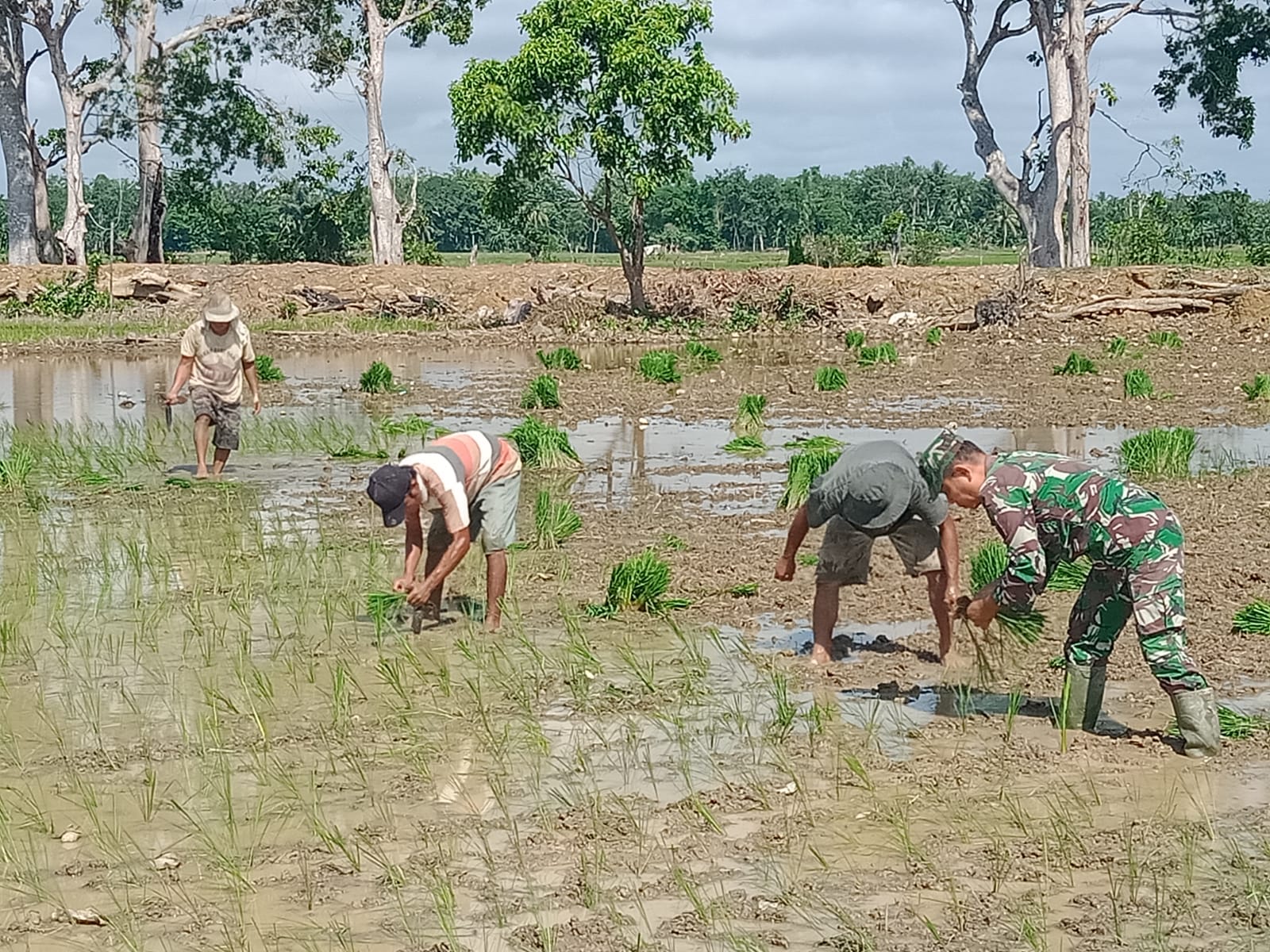 Babinsa Koramil 1002-04/Labuan Amas Selatan membantu petani lokal menanam padi di lahan seluas 2 hektar milik Bapak Maseran dari Kelompok Tani Ketuping.
