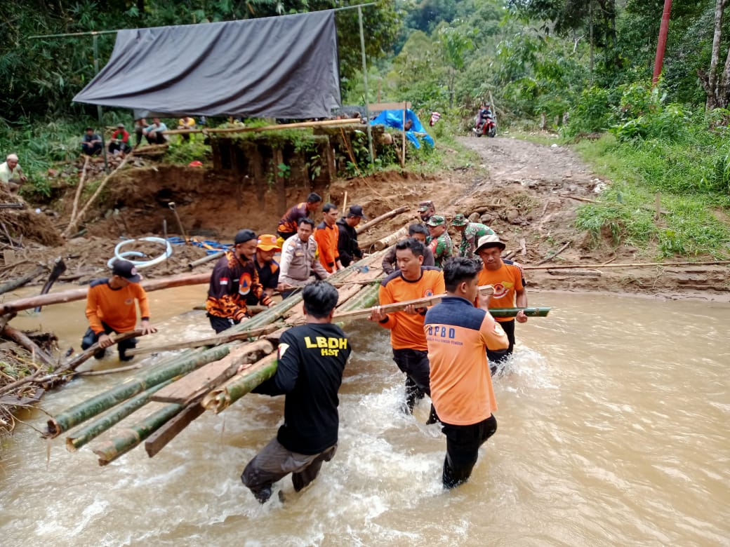 BARABAI-Anggota Koramil 1002-07/Batu Benawa, Polsek Hantakan dan Anggota BPBD Kab.Hulu Sungai Tengah bersama warga masyarakat Patikalaian melaksanakan gotong royong pembuatan jembatan darurat.Senin (09/11/2021).