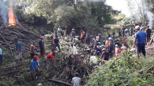 Bahu membahu anggota TNI bersama puluhan warga masyarakat mengangkat tumpukan sampah dari ranting-ranting pohon akibat penyempitan dan pendangkalan sungai.
