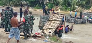 BARABAI-Kembali anggota Kodim 1002/Barabai bersama warga masyarakat melanjutkan pembuatan jembatan darurat di desa Baru kecamatan Batu Benawa yang rusak akibat derasnya arus sungai Benawa 1 April 2021 lalu.