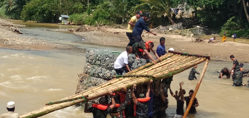 Kondisi saat ini TNI dan warga masyarakat sedang melakukan pemasangan jembatan darurat dari bambu yang disusun dengan bantalan dari batang pohon kelapa.Selasa (6/4).
