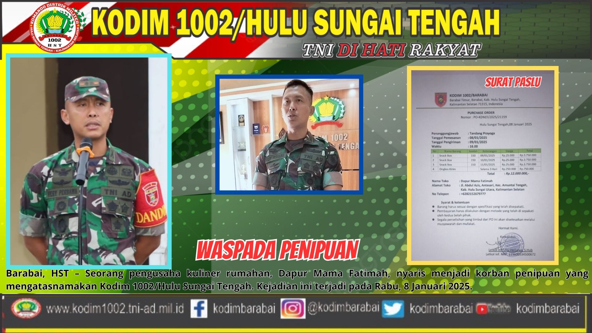 Barabai, HST – Seorang pengusaha kuliner rumahan, Dapur Mama Fatimah, nyaris menjadi korban penipuan yang mengatasnamakan Kodim 1002/Hulu Sungai Tengah. Kejadian ini terjadi pada Rabu, 8 Januari 2025.