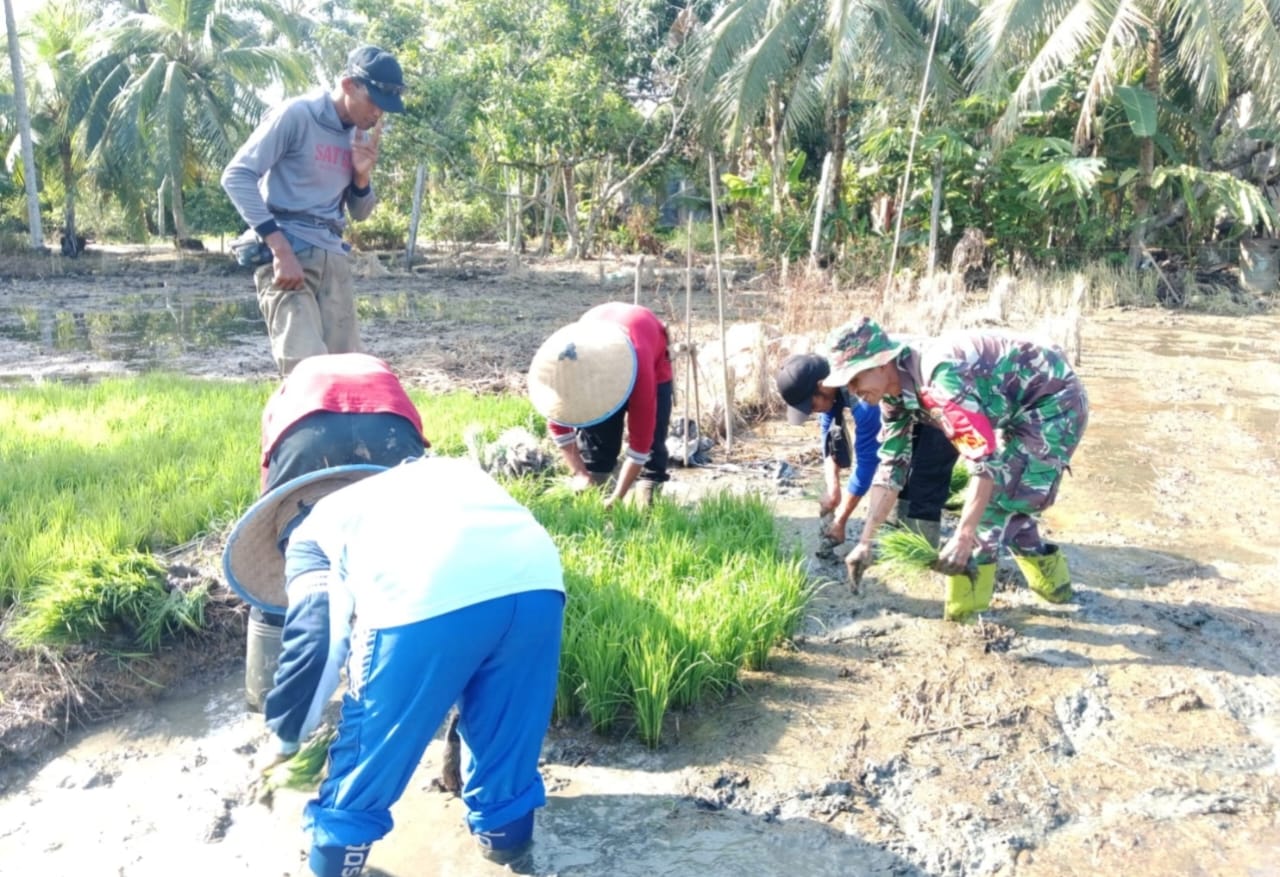 Barabai – Dalam rangka mendukung program ketahanan pangan nasional, Babinsa Koramil 1002-01/Batang Alai Selatan Sertu Maidi Rahman melaksanakan pendampingan tanam padi bersama kelompok tani Mekar Jaya di Desa Kapar, Kecamatan Batang Alai Selatan, Kabupaten Hulu Sungai Tengah, Kamis (3/7).